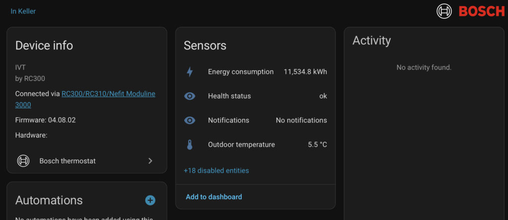 Reproduzierbar alle zwölf bis sechzehn Stunden zeigten mir sowohl das Bedienpanel der Heiztherme als auch Home Assistant an, dass keine Daten mehr fließen. Die LED am Netzwerk-Port hingegen waren weiter am Leuchten und zeigten die aktive Verbindung an. Eine Lösung für das Problem fand ich trotz langer Suche und Unmengen an Versuchen nicht.