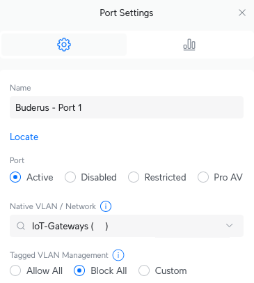 Meister „gierig“ schrieb bereits im sechsten Eintrag von Netzwerkkarten, die nicht mit „tagged frames“ und damit nicht mit meiner VLAN-Konfiguration klarkommen. Ergo: Die Netzwerkkarte meiner Buderus verschluckt sich an den VLAN-Tags in den Netzwerk-Paketen. Die Lösung war sofort klar: Der Port, an der die Buderus hängt, bekommt ein VLAN-Tag fest zugewiesen und unter „Tagged VLAN Management“ wähle ich „Block All“. Fertig. Seitdem läuft die Netzwerk-Karte stabil – nun schon seit Wochen.